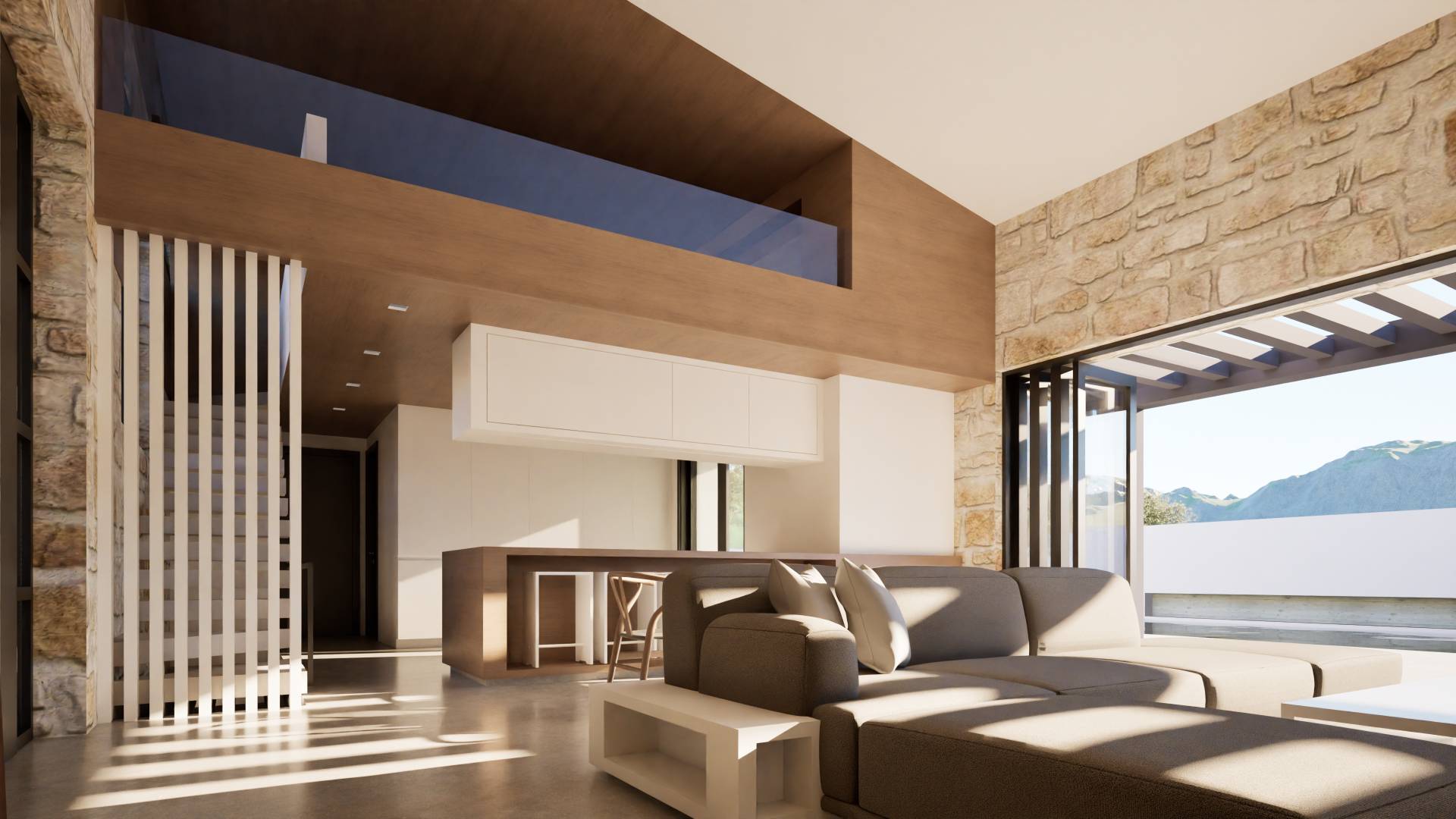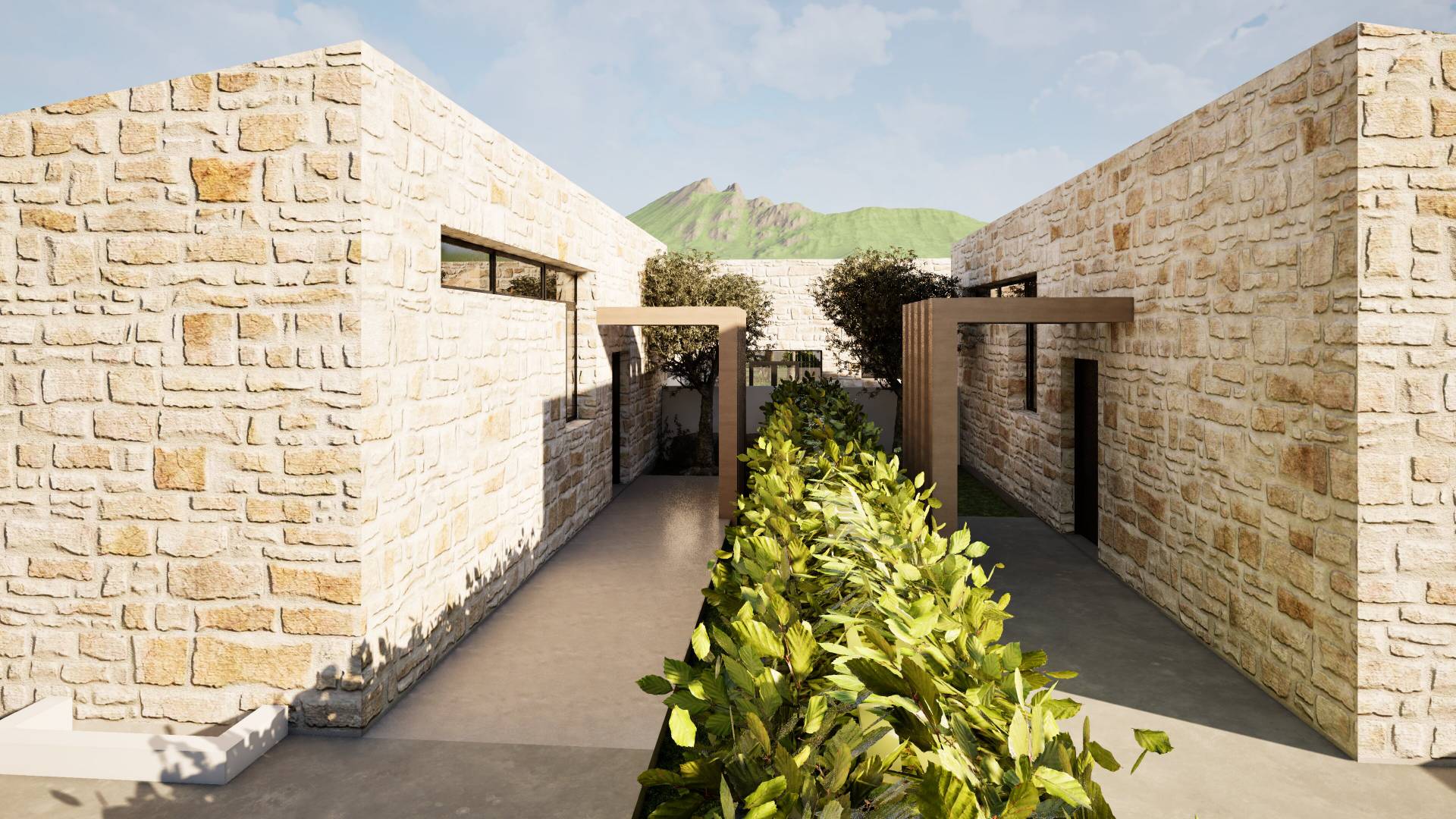 Η κατασκευή πραγματοποιείται με σύγχρονα υλικά και παραδοσιακά στοιχεία, όπως η χρήση πέτρας, συνδυάζοντας διαχρονική αισθητική με υψηλή ενεργειακή απόδοση και ανθεκτικότητα στον χρόνο.